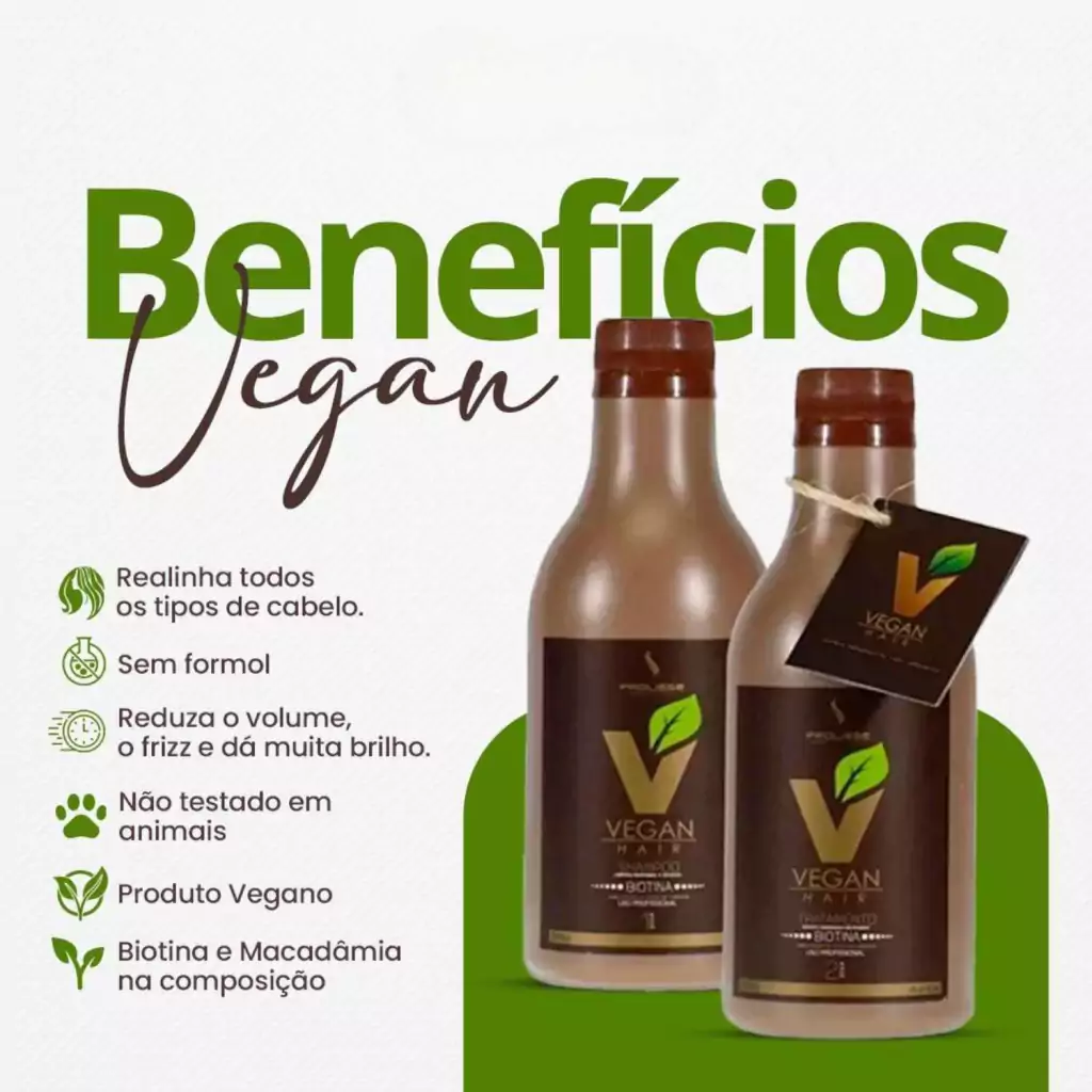 A Vegan Hair possui fórmula possui ácidos orgânicos e blend de vitaminas que promove o alinhamento dos fios, reduz o volume e frizz, além de muito brilho e tratamento aos cabelos.